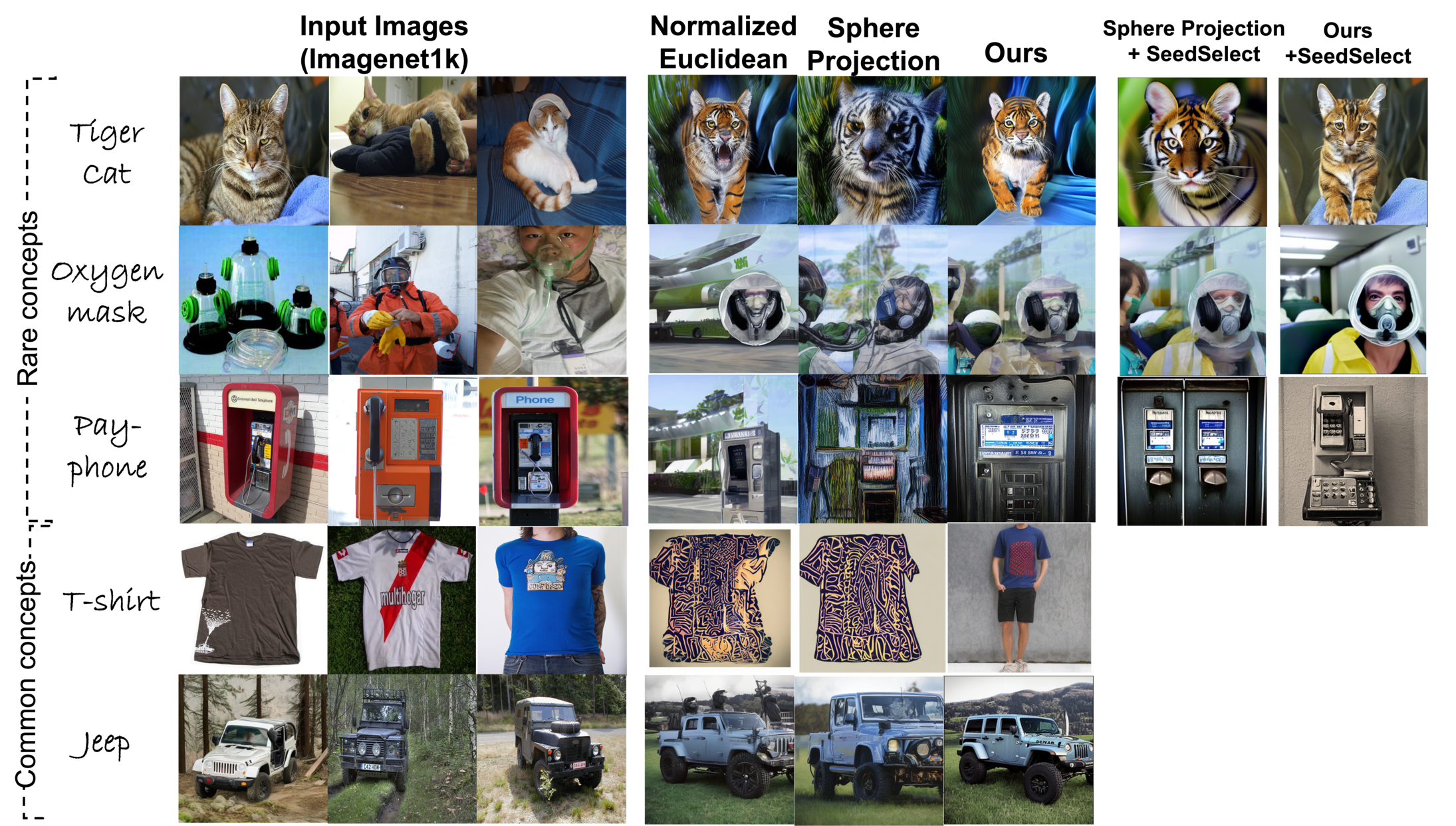 Text-to-image diffusion models show great potential in synthesizing a large variety of concepts in new compositions and scenarios. However, their latent seed space is still not well understood and has been shown to have an impact in generating new and rare concepts. Specifically, simple operations like interpolation and centroid finding work poorly with the standard Euclidean and spherical metrics in the latent space. This paper makes the observation that current training procedures make diffusion models biased toward inputs with a narrow range of norm values. This has strong implications for methods that rely on seed manipulation for image generation that can be further applied to few-shot and long-tail learning tasks. To address this issue, we propose a novel method for interpolating between two seeds and demonstrate that it defines a new non-Euclidean metric that takes into account a norm-based prior on seeds. We describe a simple yet efficient algorithm for approximating this metric and use it to further define centroids in the latent seed space. We show that our new interpolation and centroid evaluation techniques significantly enhance the generation of rare concept images. This further leads to state-of-the-art performance on few-shot and long-tail benchmarks, improving prior approach in terms of generation speed, image quality, and semantic content.